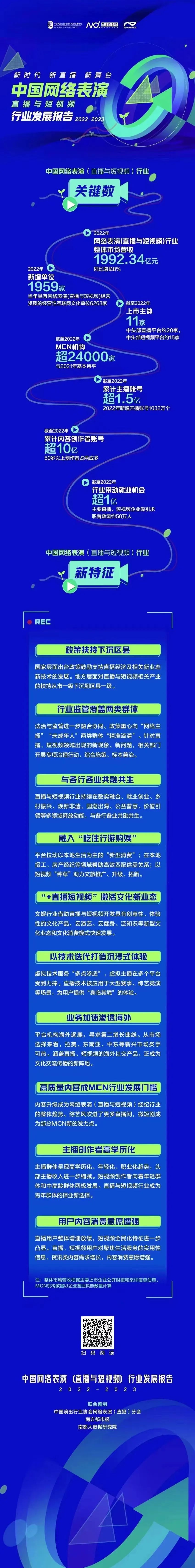 报告由中国演出行业协会网络表演(直播)分会、南方都市报、南都大数据研究院联合编制,基于对30家业内主要直播、短视频平台及MCN机构的一手调研访谈,回顾2022年以来直播与短视频行业的规模数据、发展方向、创新成果,以及行业在经济、社会、文化领域的价值作用。 报告中披露7组行业关键数据和10个最新特征。报告指出,新阶段下,直播、短视频平台逐步向互联网基础应用过渡,通过深度赋能数实融合、就业创业、文旅推广、助农普惠等,服务于网络强国、数字中国建设,助力“构建新发展格局,推动高质量发展”。